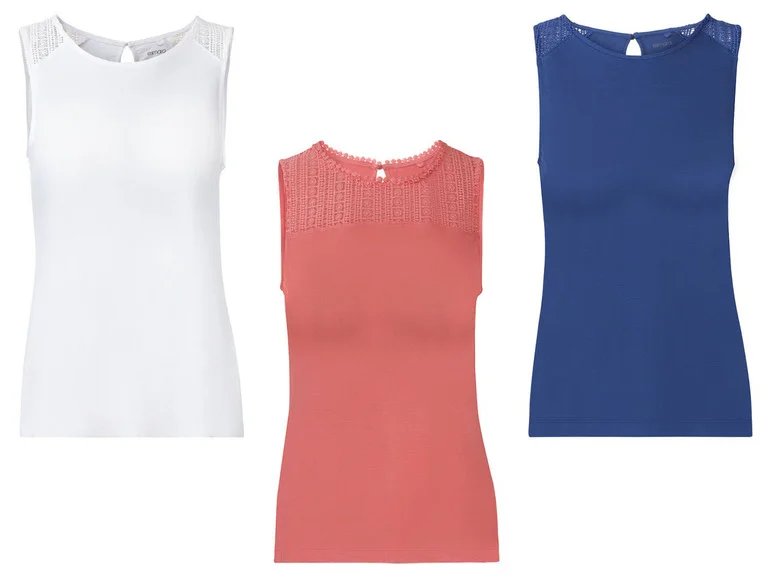 ESMARA® top women, slightly tailored cutAvailable in: coral, white & blue Fit: slightly tailored cutFeatures: with round neckline and fashionable crochet laceSpecial features: button closure with slit in the neck✓ Pleasantly soft and cuddly✓ Optimal fit thanks to the elastane LYCRA®