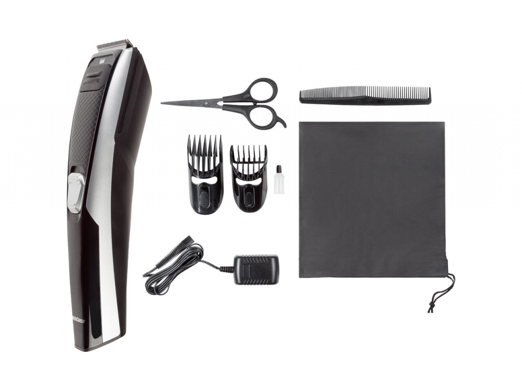 SILVERCREST® hair and beard trimmerPrecision ground stainless steel cutting set – removable2 Vario attachment combs for 12 cutting lengths and thinning functionOptional battery or mains operationIncluding scissors, comb, blade oil, power adapter, cleaning brush and storage bag