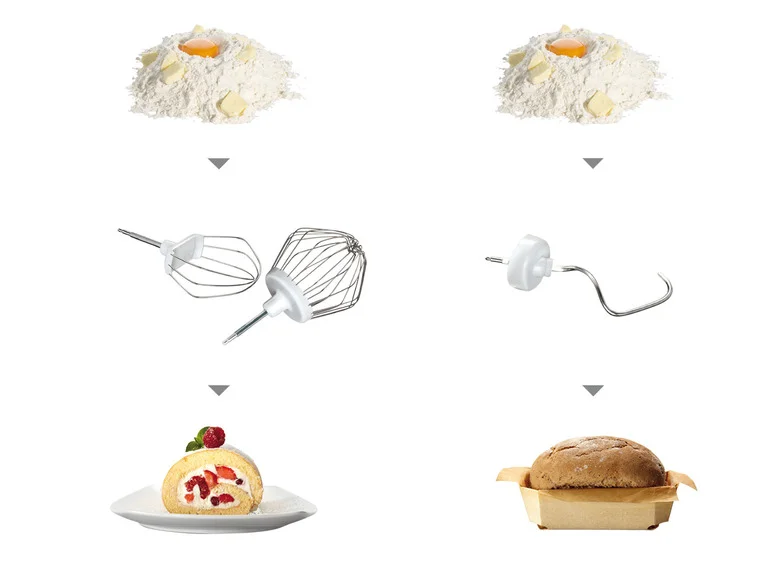 Patisserie set: whisk, whisk and dough hook for perfect baking. Made of stainless steel and therefore dishwasher-safe.