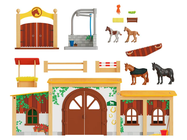 Play set consisting of the base station, broom, mop, wooden feather duster as well as a hand brush and dustpan made of plastic