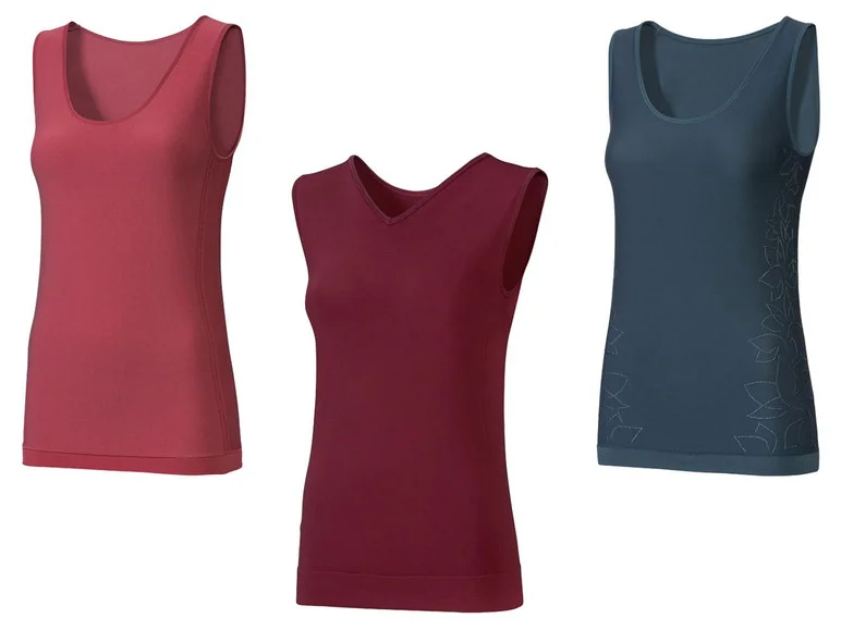 CRIVIT® women’s functional tank, quick-drying and moisture-wicking properties Quick drying and moisture wicking Seamless – without annoying side seams Global Recycled Standard certified Made with recycled material Different knitting zones Available in: navy, burgundy & pink Navy: made from 59% recycled material Navy & pink: with a round neckline Bordeaux: with a V-neck Bordeaux & pink: Made from 58% recycled material Optimal fit and dimensional stability thanks to the LYCRA® brand