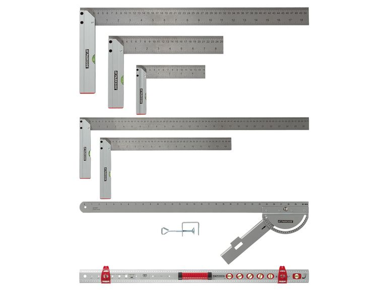 PARKSIDE measuring tools properties Stop bracket set 2 pieces: For measuring lengths up to 700 mm 90 ° angle With scale and spirit level (cm / inch) 2 parts Stop bracket set 3 pieces: For measuring lengths up to 500 mm 90 ° angle With scale and spirit level (cm / inch) 3-part Universal saw bar: For easy alignment of pictures, mirrors, shelves and sockets 5 vials for 22.5 ° –45 ° –67.5 ° –90 ° –180 ° angle measurements – horizontal and vertical 2 movable marking aids 6 marking holes, e.g. for drilling 1 removable dragonfly Scale with metric scale: 100 cm Including mountable handle Marking spirit level: Guide rail for exact and straight cuts when working with circular and jigsaws With length and angle scale (millimeter / degree graduation) Easier work with two-handed handling of saws Longitudinal scale: 0–77 cm Angle scale: 70 ° -0 ° -70 ° Made of high quality tool steel material 2-piece stop bracket set, 3-piece stop bracket set: aluminum, stainless steel Universal saw bar: carbon steel Marking spirit level: aluminum Dimensions Stop bracket set, 2-part: approx. L 400/700 mm Stop bracket set, 3-part: approx. L 150/250/500 mm Universal saw bar: approx. L 770 mm Marking spirit level: approx. L 1000 mm Weight Stop bracket set, 2-part: approx. 580 g Stop bracket set, 3-part: approx. 500 g Universal saw bar: approx. 1,495 g Marking spirit level: approx. 380 g