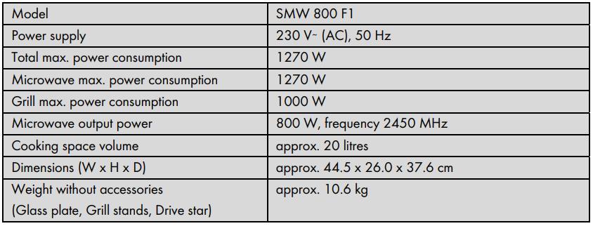 Silvercrest Kitchen Tools microwave, 700 W properties For heating and thawing With 5 power levels (120 W, 230 W, 385 W, 540 W, 700 W) Intuitive operation with rotary controls for setting time and power Duration adjustable from 0 to 35 minutes 35-minute timer with end of cooking signal Incl. Glass turntable * Technical specifications Microwave power: 700 W Nominal voltage: 230V ~, 50Hz Interior volume: approx. 20 l Dimensions approx. 44 x 25.9 x 36 cm