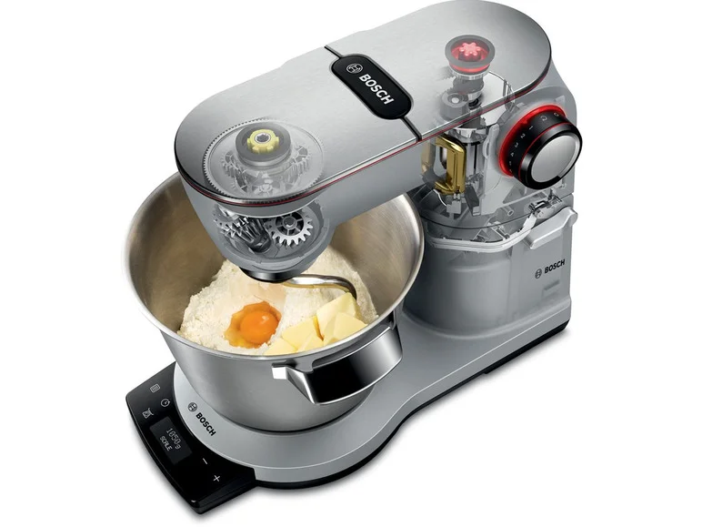 Included accessories: Splash guard with filling opening, dough hook, whisk and beater
