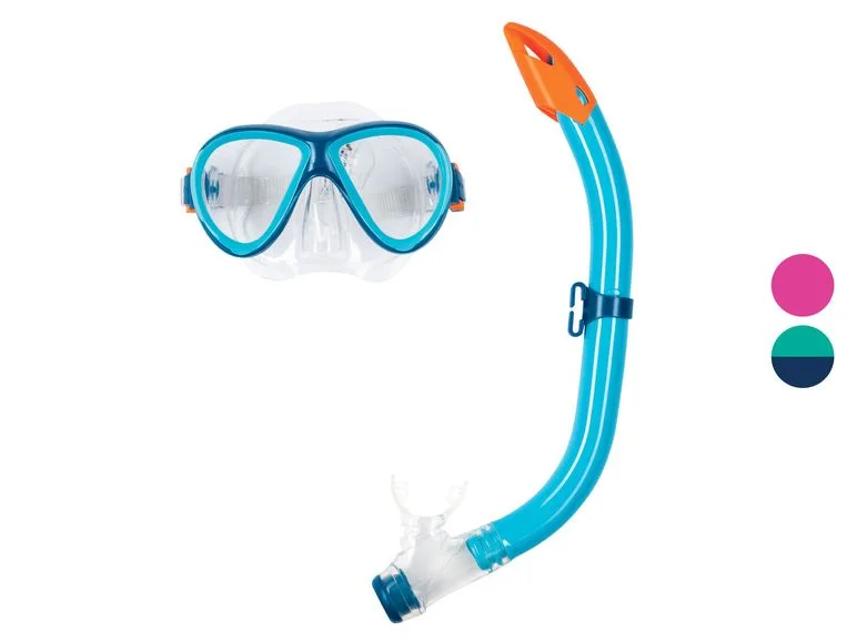 CRIVIT® snorkel set, for children properties Mask body and split mask strap made of high-quality, soft silicone for comfortable wearing and a good fit Swivel quick release buckles “Semi-Dry-Top” – prevents splash water from penetrating the surface and the signal color also ensures good visibility Soft, anatomically shaped silicone mouthpiece Blow-out valve for draining off any water that has entered material silicone