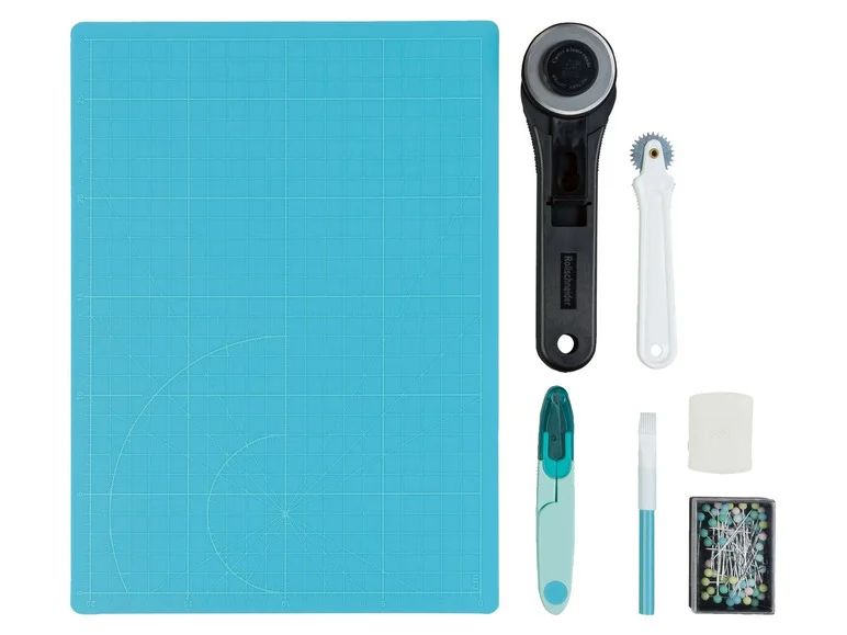 For cutting: 1 marking wheel, 1 Schneider marking pen with brush, 1 measuring tape 150 cm, 1 tailor’s scissors with blade protection, 1 seam ripper, 1 rotary cutter