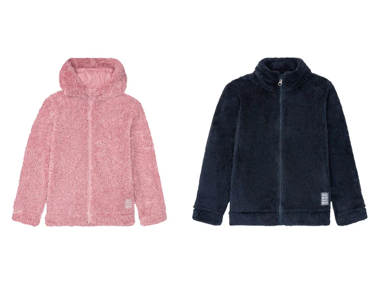 LUPILU toddler girls teddy jacket, in plush quality characteristics Made of cuddly soft and warming plush quality High quality YKK brand zipper with chin protection Available in: Pink & Navy Pink: side pocket Navy: With hood and kangaroo pocket